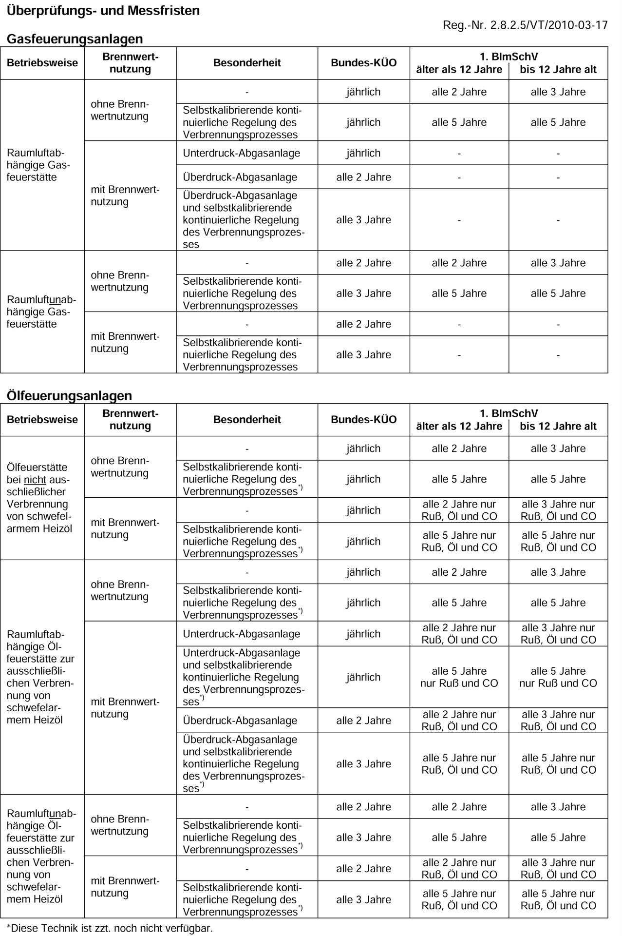 In dieser Tabelle können Sie nachsehen, in welchen zeitlichen Abständen der Schornsteinfeger bzw. die Schornsteinfegerin Ihre Öl- oder Gasfeuerungsanlage überprüft.